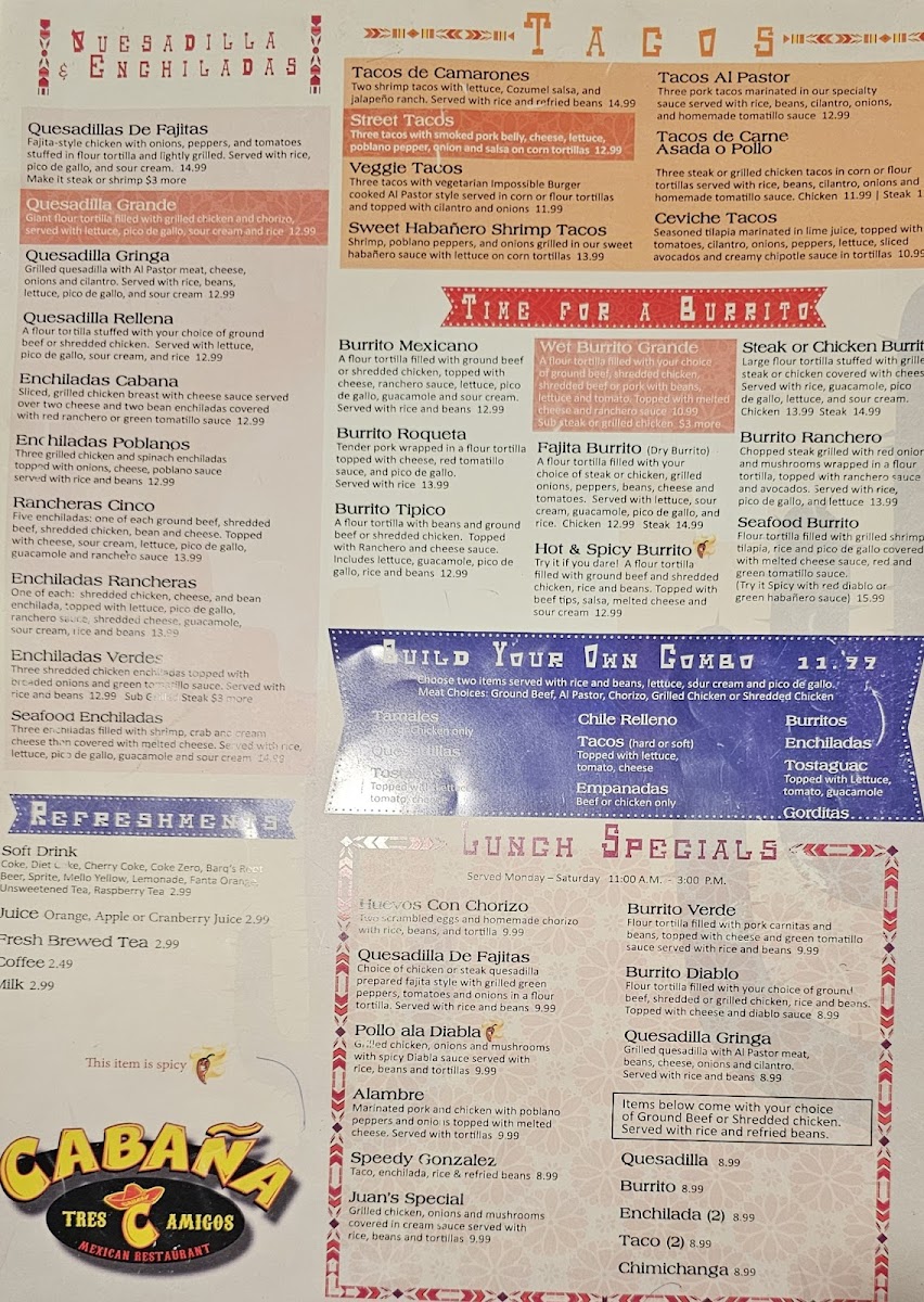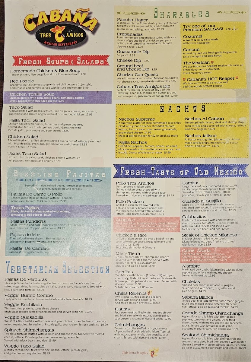 Introducing the menu at Cabana Tres Amigos, a vibrant Mexican eatery located in Grand Rapids, MI, where the atmosphere is as lively as the dishes served. From the moment you step in, you’re welcomed with complimentary chips and salsa, a delightful preview of the culinary adventure ahead. Patrons rave about the hearty portions and the excellent drink selection, particularly the refreshing frozen margaritas.